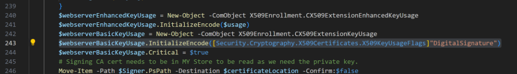 The line #243, show that the DataEncipherment key usage flag is passed explicitly for the certificate.