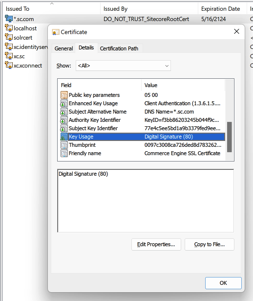 But wait, why did I not get the error for the Sitecore CM, as he faced and mentioned in this article? When I checked the SSL certificates for the Sitecore CM, I found that the key usage is Digital Signature, which is as expected for the website to open in the browser on local system.